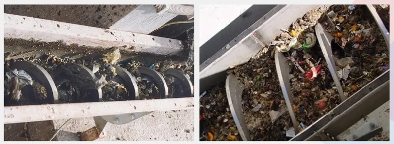 当厨余垃圾螺旋输送机工作时,通过传动电机带动螺旋叶片转动,送入进料口的餐厨垃圾沿螺旋叶片在壳内转动,受到壳壁上的摩擦力阻止和螺旋叶片的挤压,餐厨垃圾物料随螺旋推动做轴向运动,直到从出料口排出,物料中渗出和挤出的油水混合液经沥水筛筒过滤从排液口流出。