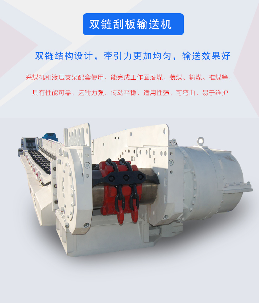 双链刮板输送机采用双排刮板链牵引,在槽内运送散料的输送机,适用于不同条件下的采煤工作面,能与各种类型的采煤机和液压支架配套使用,能完成工作面落煤、装煤、输煤、推煤等,具有性能可靠、运输力强、传动平稳、适用性强、可弯曲、易于维护等特点。