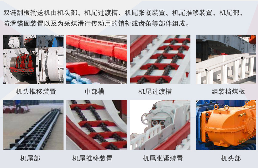 双链刮板输送机由机头部、机头推移装置、机头张紧装置、机头过渡槽、中部槽、组装铲煤板、组装挡煤板、机尾过渡槽、机尾张紧装置、机尾推移装置、机尾部、防滑锚固装置以及为采煤滑行传动用的销轨或齿条等部件组成。用户可根据所需的配套情况选取相应的部件组成整机。