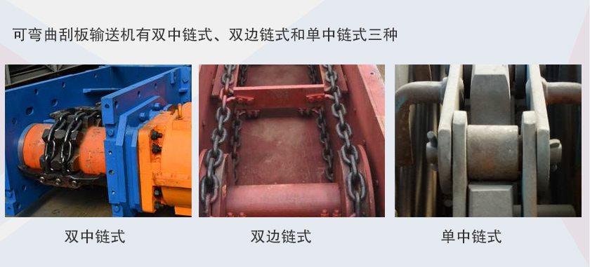 可弯曲刮板输送机有双中链式、双边链式和单中链式三种,输送物料时,刮板在机头动力的带动下在中部槽内拖动运行,经机尾回程后循环运行。
