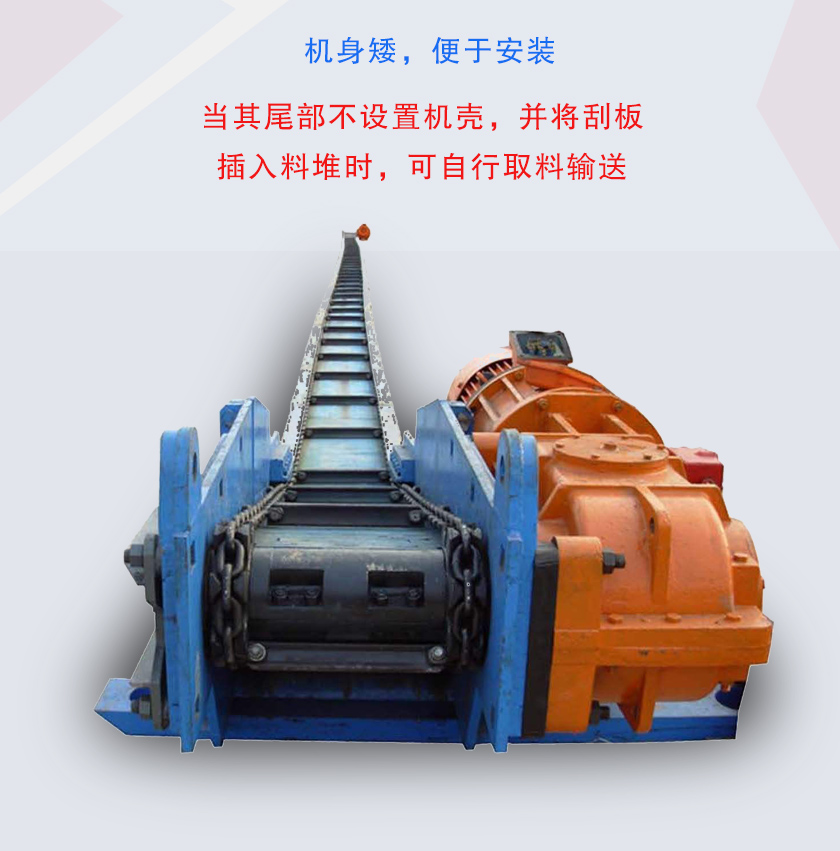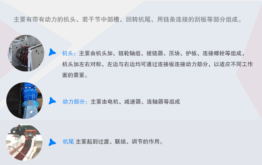 主要有带有动力的机头、若干节中部槽、回转机尾、用链条连接的刮板等部分组成。