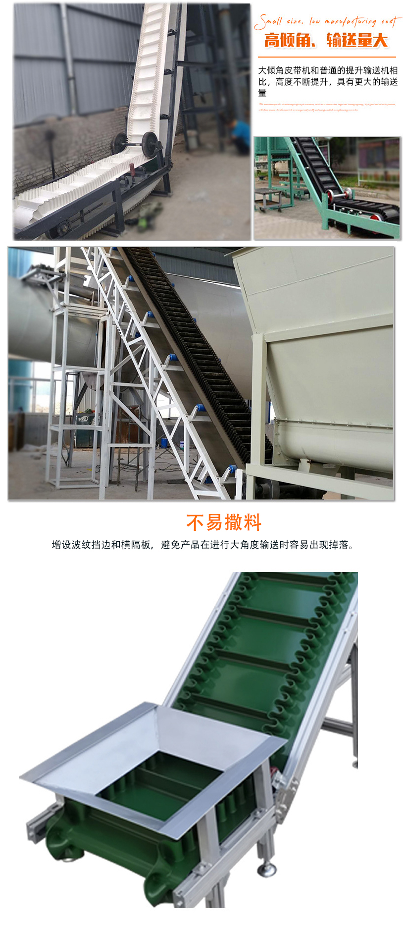 大倾角皮带输送机简称大倾角皮带输送机,主要用于大倾角或垂直90°输送散状物料,解决普通、花纹带式输送机所不能达到的输送角度,大倾角皮带输送机是在平形橡胶运输带两侧粘上可自由伸缩的橡胶波形立式"裙边",在裙边之间又粘有一定强度和弹性的横隔板组成匣形斗,可以防止物料撒落。
