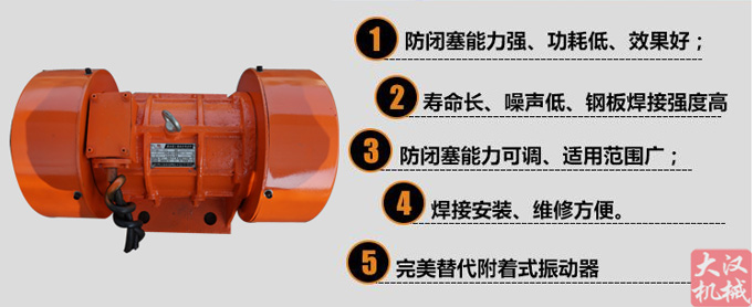 当防闭塞装置工作时,振动电机的高速转动,便产生了对料仓壁的周期性高频振动,由于防闭塞装置的周期性振动,一方面使物料与仓壁脱离接触、消除物料与仓壁的摩擦,另一方面使物料受交变速度和加速度的影响,处于不稳定状态,从而有效地克服物料的内摩擦力和聚集力,以消除料仓内物料间的相对稳定性,使物料从料仓口顺利排出。