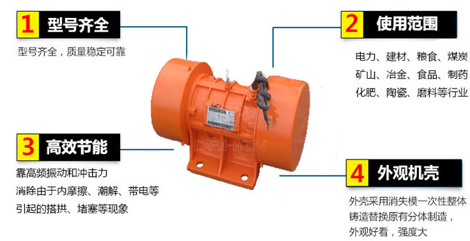 广泛的应用在水电建设、火力发电、建筑、建材、化工、采矿、煤炭、冶金、轻工等工业部门。振动电机除了可以应用与一般振动机械外,还可以组合多种振动形式。如:平旋型,涡旋型,摇动振动型,组合直线型,组合长椭圆型,复合双频型,复合双幅型等。由这些振动形式可以产一些过去所没有的新型振动机械。