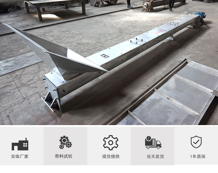 不锈钢有轴螺旋输送机:304或316L制成,造价高,不生锈耐腐蚀,耐高温可达300℃,卫生标准高,多用于食品加工厂、医药厂或部分化工厂输送使用,不对物料造成污染。